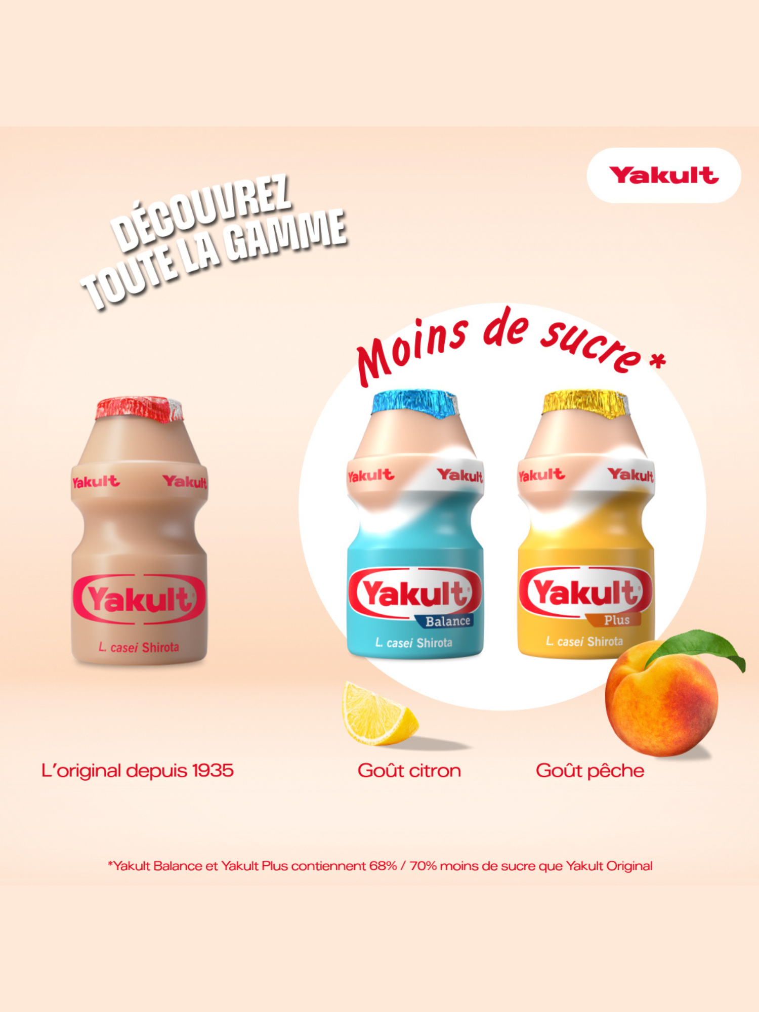 - Yakult Plus, riche en vitamine C, goût pêche, il contient 70 % moins de sucre que Yakult Original